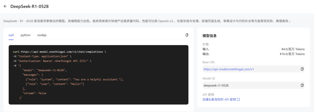步骤三:提供curl、Python、Node.js三种技术方案,快速接入模型DeepSeek-R1-0528,满足多样化开发场景及开发者使用习惯。