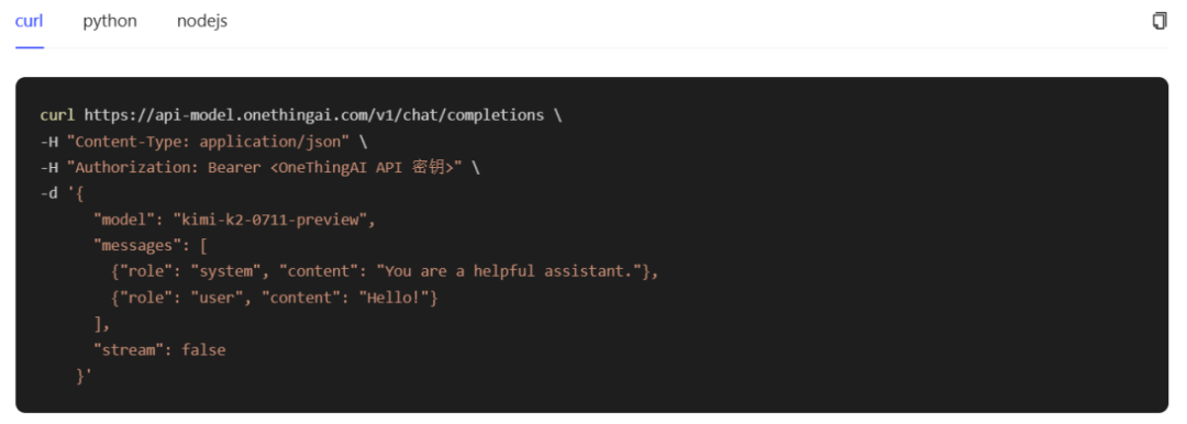 步骤三:提供curl、Python、Node.js三种技术方案,快速接入模型Kimi-K2,满足多样化开发场景及开发者使用习惯。
