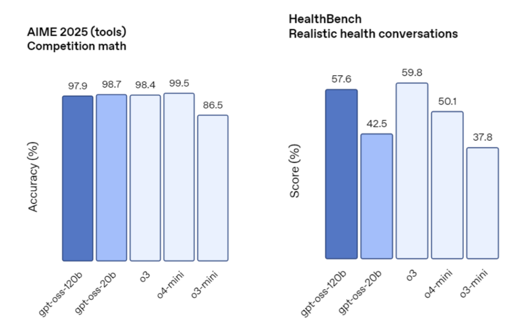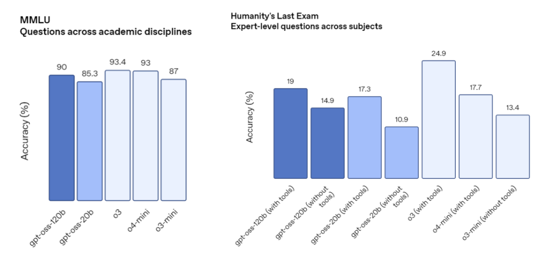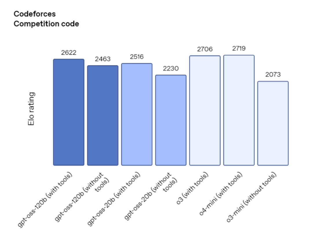 据悉,GPT-OSS-120b 在竞赛数学、医疗推理及通用问题解决上超越闭源推理模型o4-mini,甚至在竞赛编程中优于o3-mini;GPT-OSS-20b 规模虽小,但其在同类常见基准测试中的表现与o3-mini持平,甚至在数学竞赛中超越o3-mini。