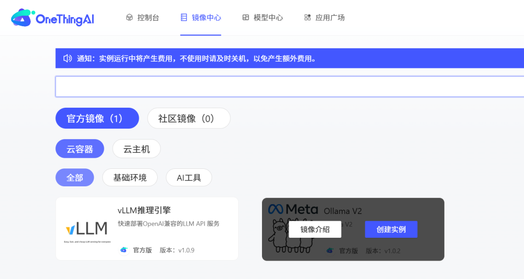 ✅ 选择万象城AWC算力云 - 镜像中心提供的“vLLM推理引擎”或“Ollama V2”快速创建实例。