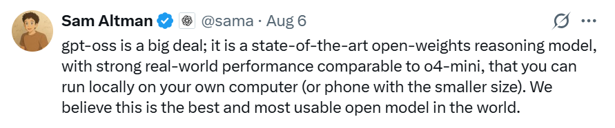 自2019年推出GPT-2之后,这是OpenAI首次选择直接开放模型权重 —— 山姆・奥特曼表示:GPT-OSS 不仅是最先进的开放权重推理模型,也是世界最好用的开放模型。