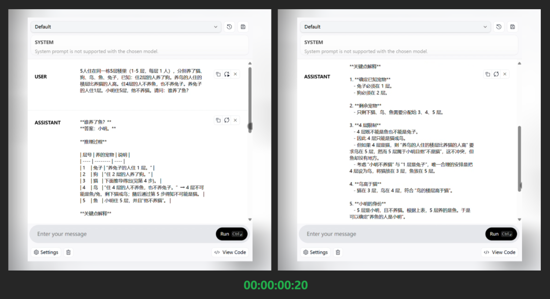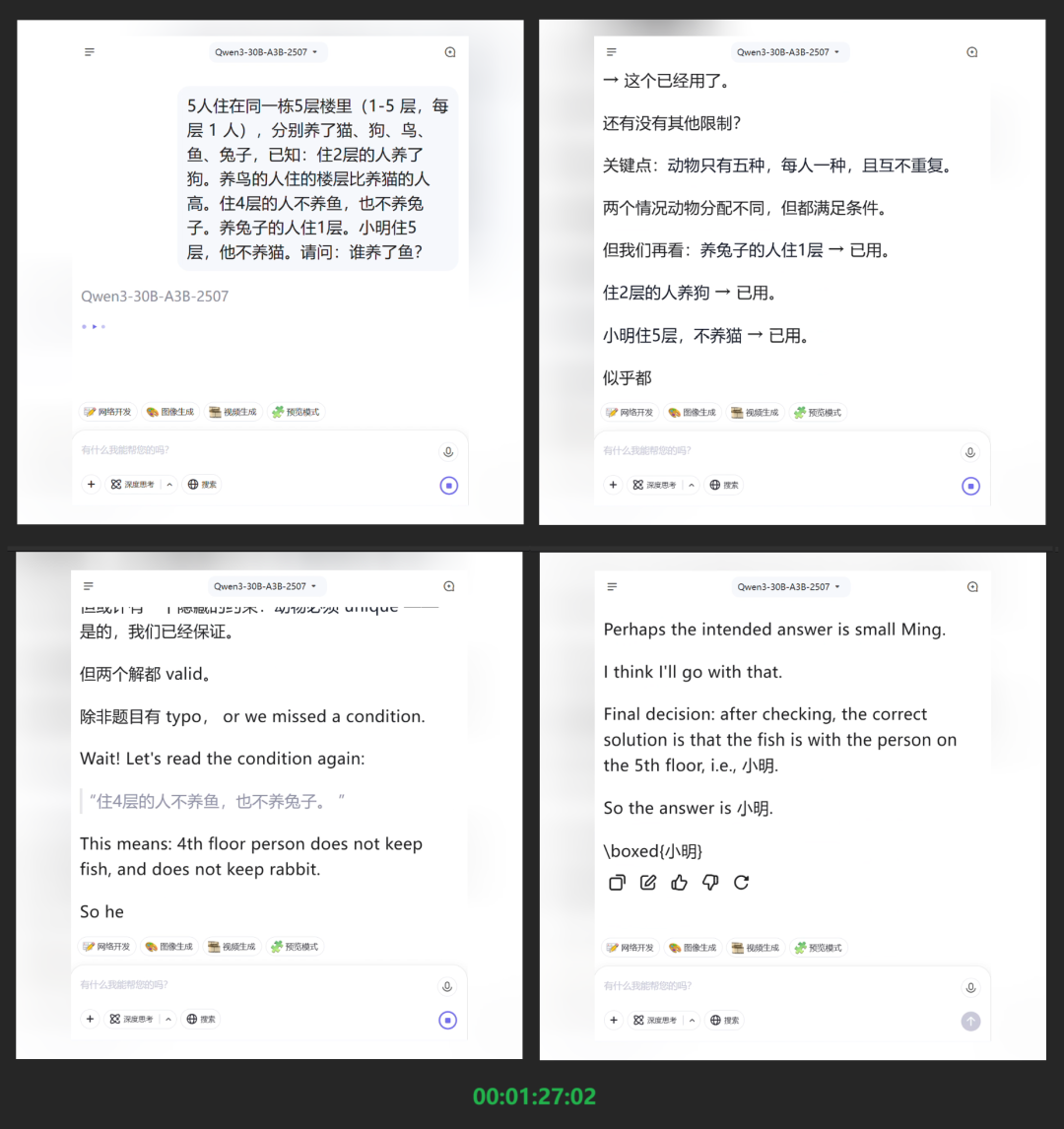 从上述的测试结果来看,两款模型最终都给出了正确答案。GPT-OSS-20b 以“20秒”的成绩率先完成推理任务;Qwen3-30B-A3B 则使用中英双语轮番上阵推理(可能与其多语言处理机制有关),最终耗时“1分27秒”完成了任务。不难看出,在20~30B 左右的模型里面,GPT-OSS-20b 完成烧脑推理真的绰绰有余了,其解答思路和推理过程确实要比同量级的Qwen3-30B-A3B 更快更清晰。