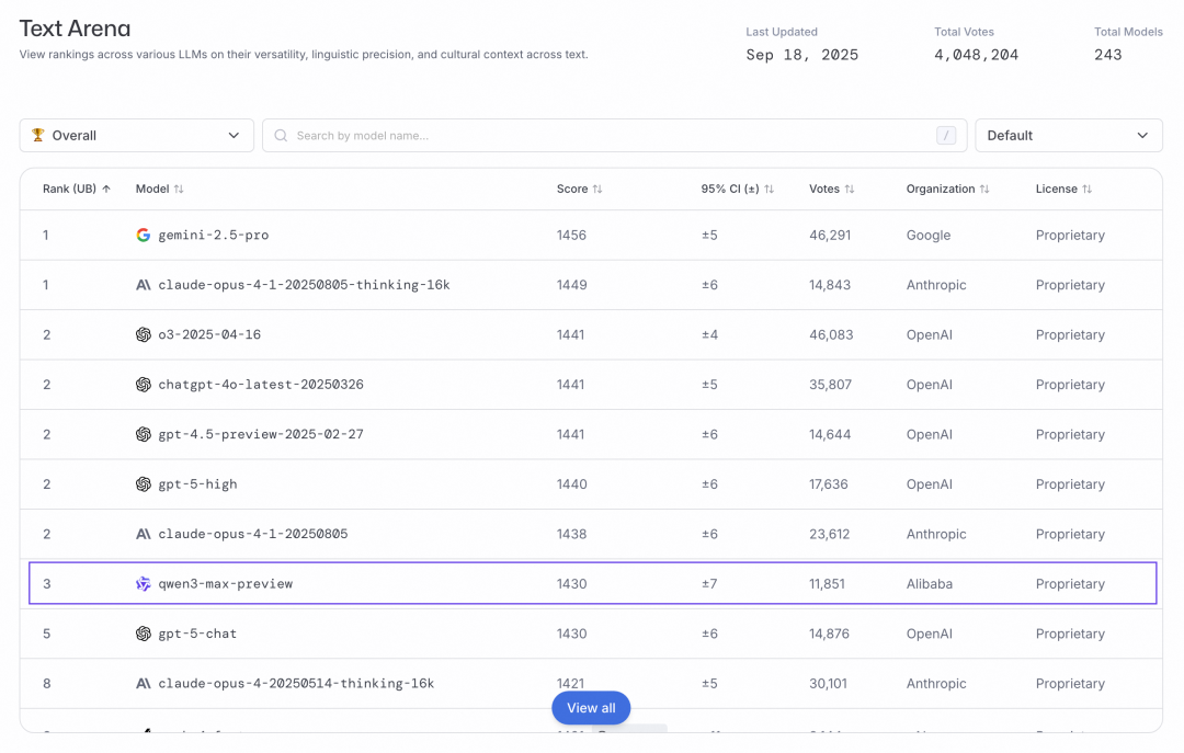 据悉,Qwen3-Max 系列模型是通义千问迄今为止规模最大、能力最强的模型,模型总参数超 1 万亿,提供指令(Instruct)和推理(Thinking)两大版本。其在最权威的 LMArena 文本排行榜上力压GPT-5,进入全球前三: