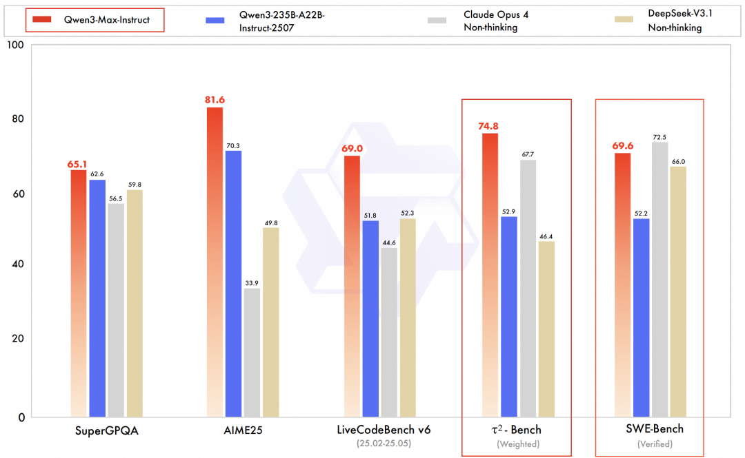 Qwen3-Max-Instruct 正式版在代码能力和智能体能力方面进一步提升。其在解决现实编程挑战的基准测试 SWE-Bench Verified 上,取得了高达69.6分的优异成绩,稳居全球顶尖模型之列。此外,在评估智能体工具调用能力的严苛基准 Tau2-Bench 上,以74.8分超越 Claude Opus 4与 DeepSeek-V3.1。
