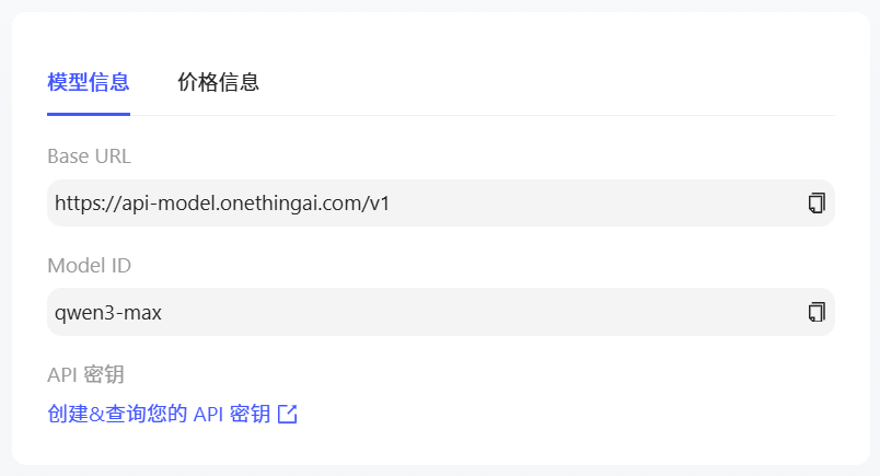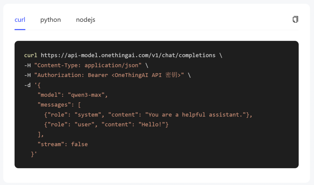 步骤三:OneThingAI平台提供curl、Python、Node.js三种技术方案,以便快速接入模型Qwen3-Max-Instruct,满足多样化开发场景及开发者使用习惯。