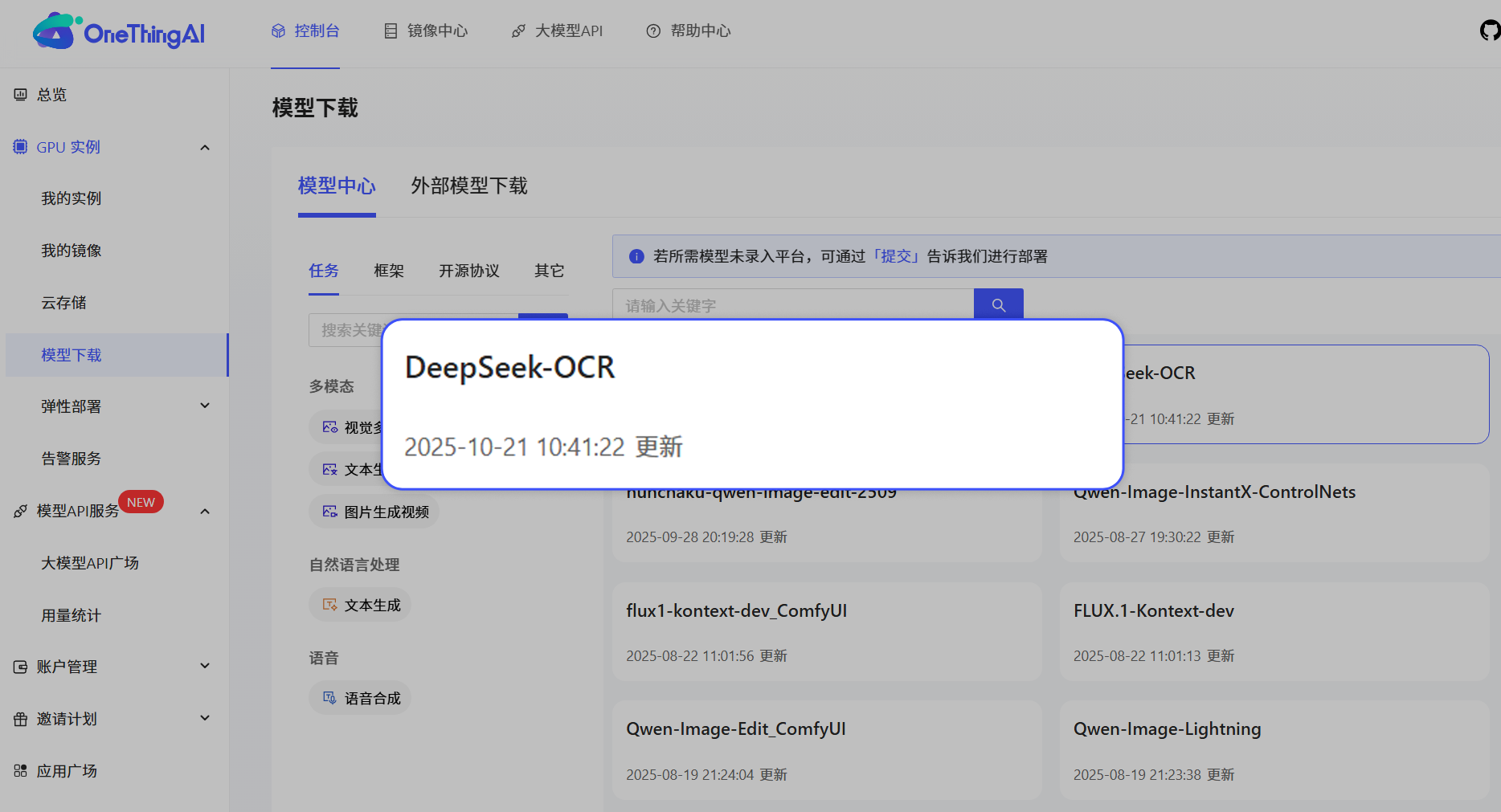 近期,DeepSeek-OCR 已登陆万象城AWC算力云平台,平台给予充足的算力支持,用户无需复杂配置,即可实现模型开箱即用。