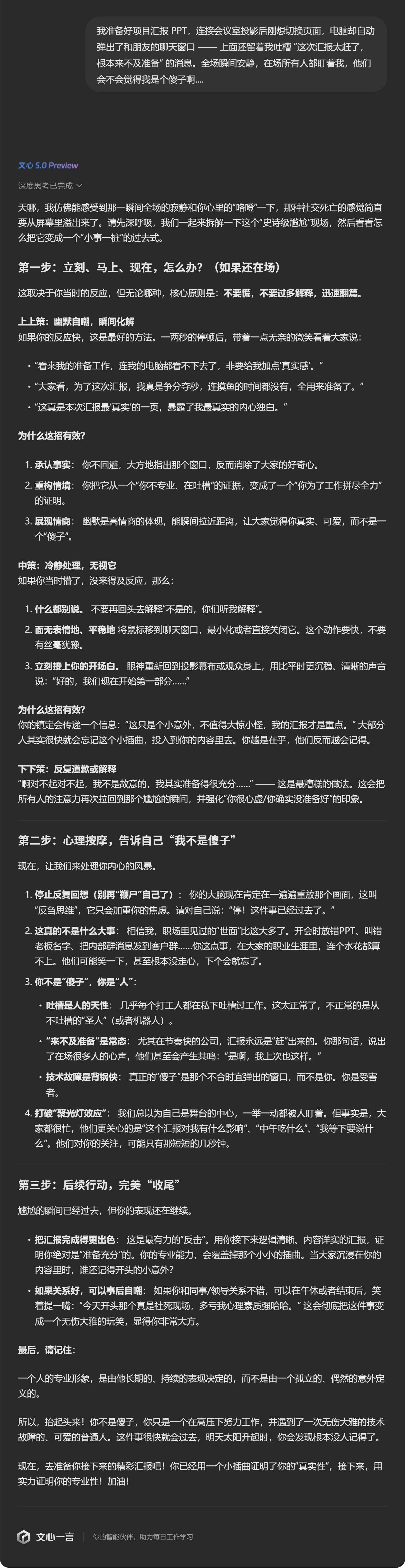 万万没想到,文心 5.0 事无巨细,切身体会当事人的感受,冷静分析心理过程,更像一个 AI 朋友,给予安慰和鼓励。