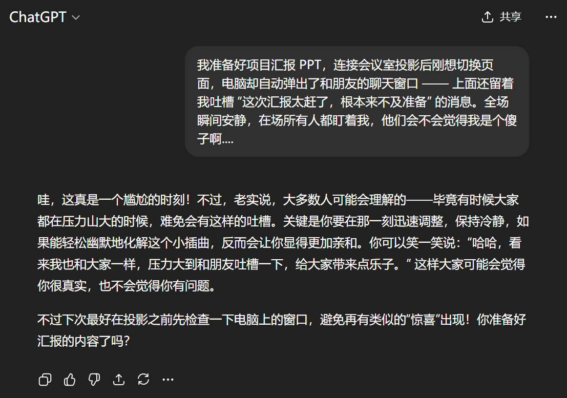 我准备好项目汇报 PPT,连接会议室投影后刚想切换页面,电脑却自动弹出了和朋友的聊天窗口 —— 上面还留着我吐槽 “这次汇报太赶了,根本来不及准备” 的消息。全场瞬间安静,在场所有人都盯着我,他们会不会觉得我是个傻子啊....