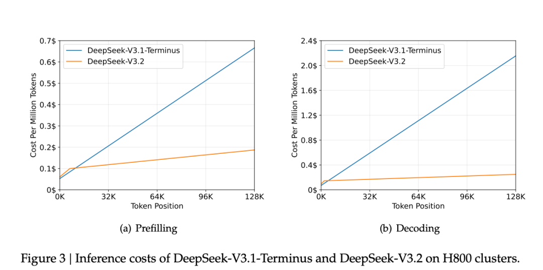 预填充阶段:V3.1 的成本随 token 长度增长呈陡峭上升(128K token 时成本达 0.7 美元 / 百万 token),而 V3.2 的成本增长极为平缓(128K token 时仅约 0.2 美元 / 百万 token);