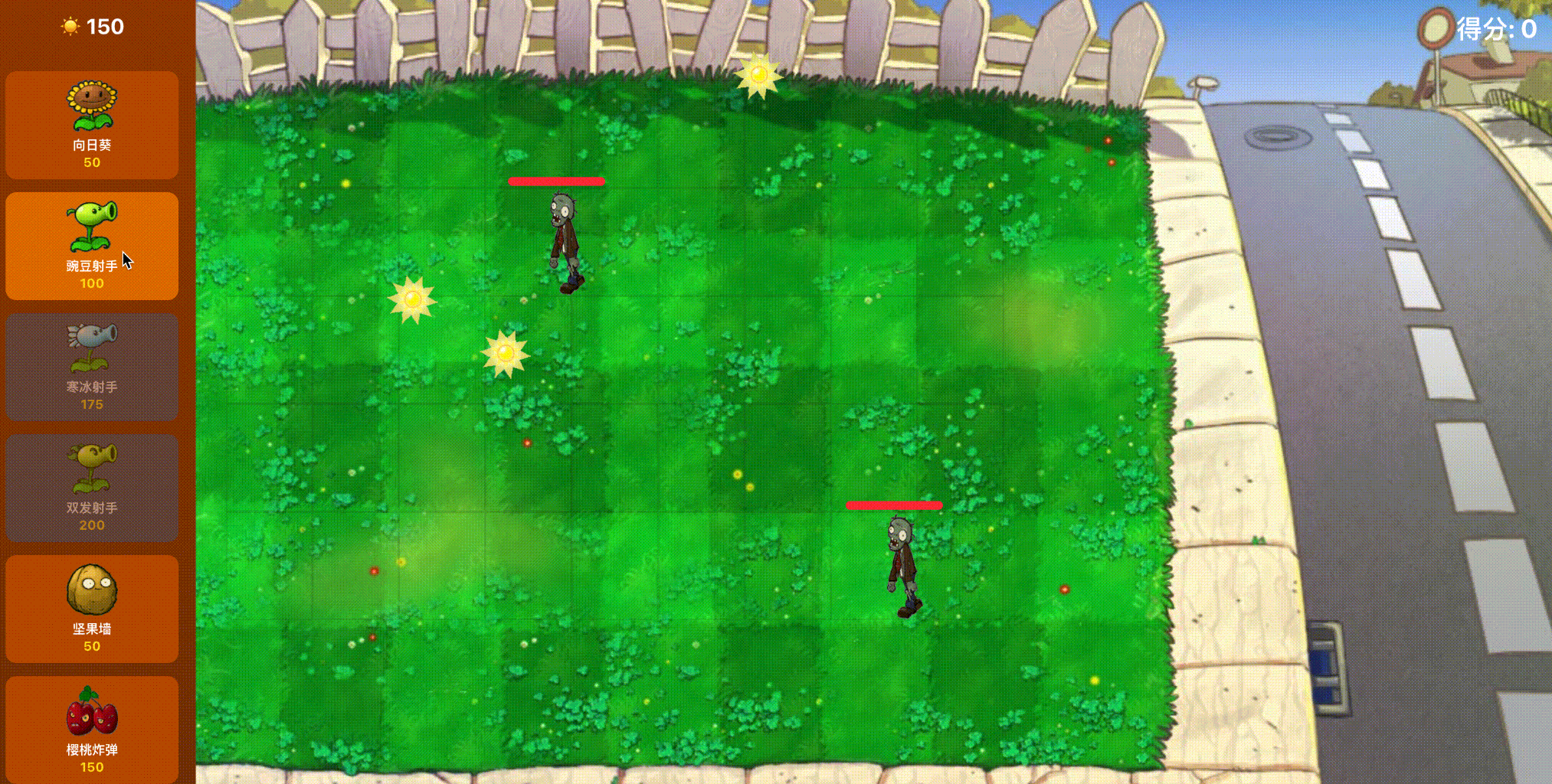 示例:基于本地素材复刻植物大战僵尸。需解析images(含GIF动画)与背景乐。实现滚动商店与阳光收集。核心逻辑:僵尸遇植物需停留攻击(非穿透);植物含射手与高血量坚果,需缩小体积以适配放大的僵尸。调整网格对齐背景并去除第一列。实现铲子跟随鼠标移除植物功能。要求方案稳健。