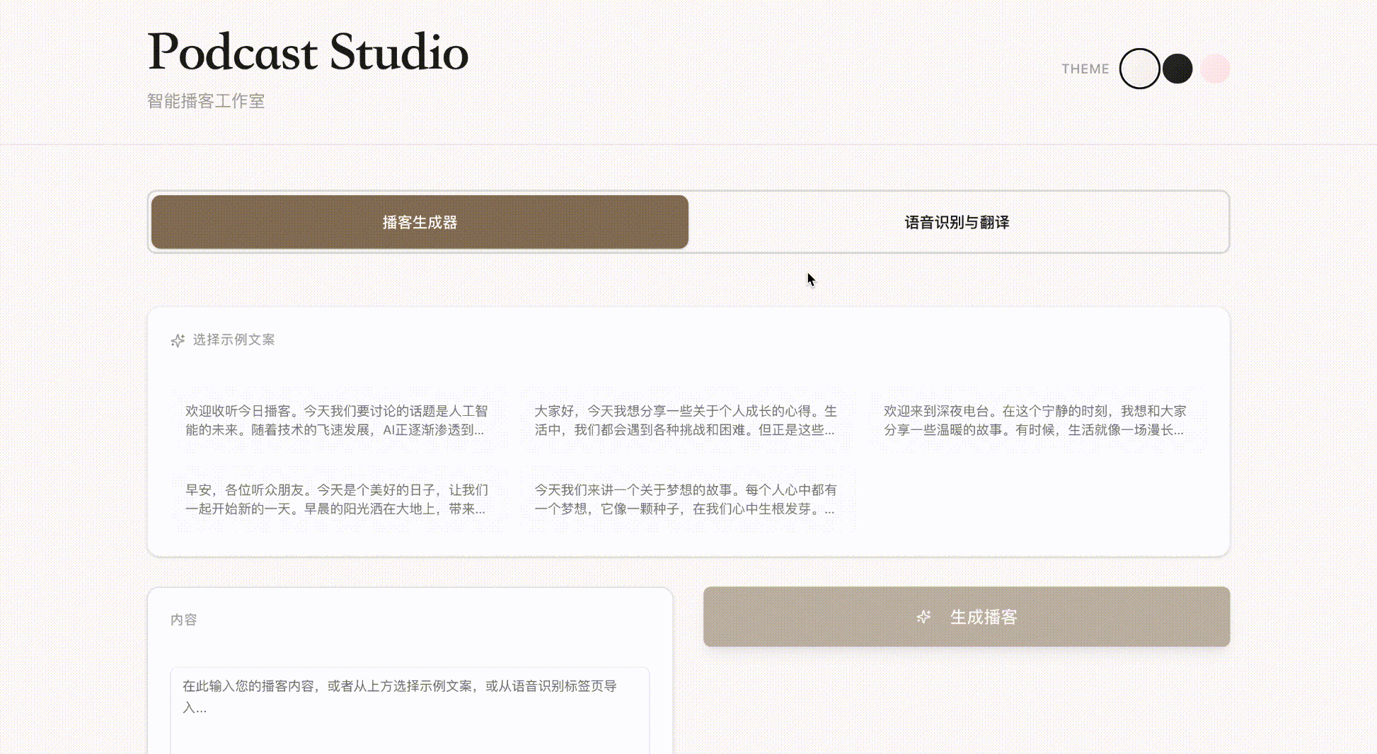 示例:设计一个能根据文字生成播客的(运用到TTS)web端应用,UI设计为黑金氛围+电影感+有柔光聚光渐变。