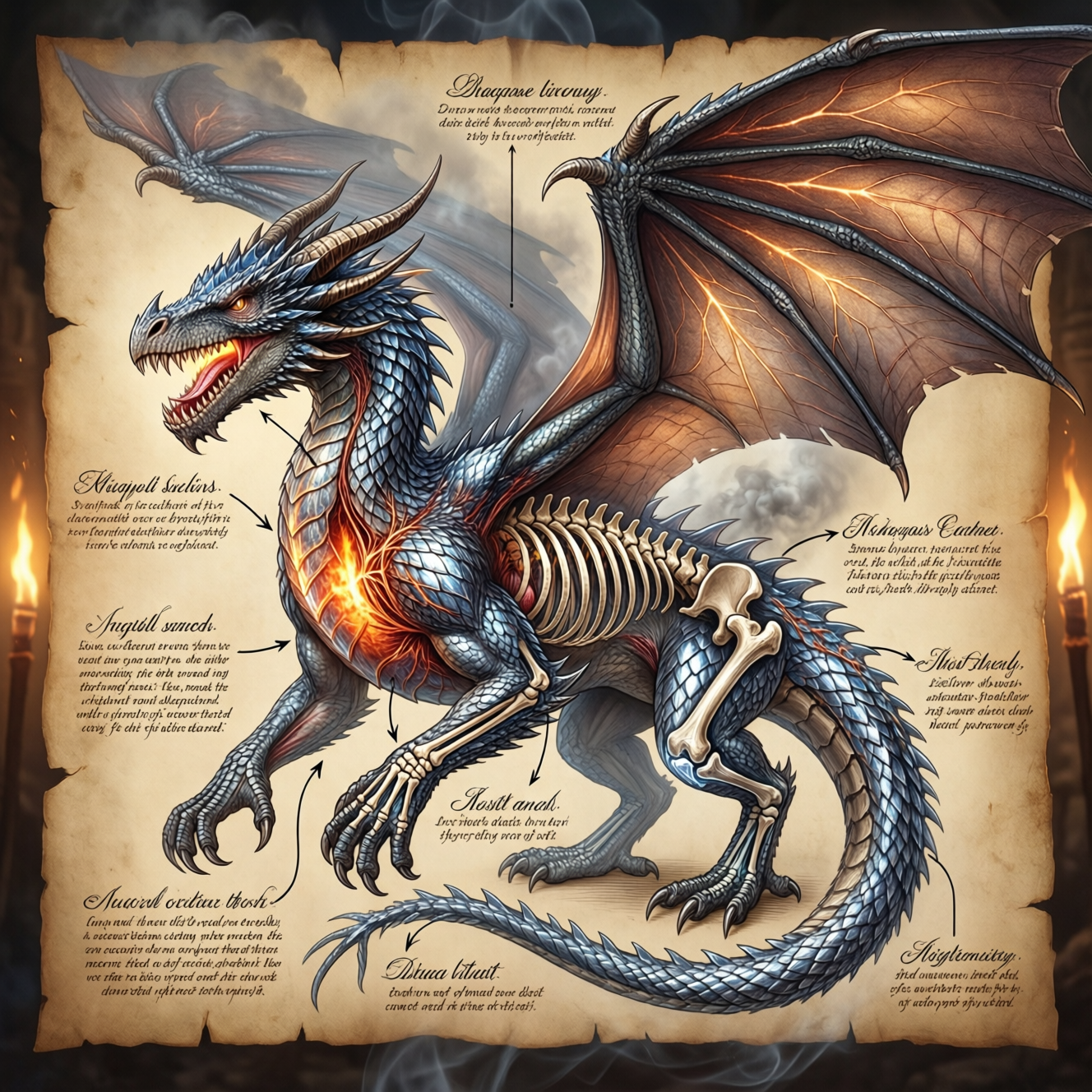 示例:创作一幅龙的解剖结构爆炸图,将龙的翅膀、鳞片、喷火腺和骨骼结构分解成带有标签和连接箭头的各个组成部分。每个部分都以精细的细节呈现,展现出金属光泽的鳞片、闪耀的脉络和晶莹剔透的骨骼。背景为古老的羊皮纸,并配以微妙的烟雾效果和温暖的火炬光影。使用优雅的草书字体添加说明性注释。横幅蓝图式海报,奇幻写实风格,高分辨率,灵感源自达芬奇的草图,并融入现代数字技术。