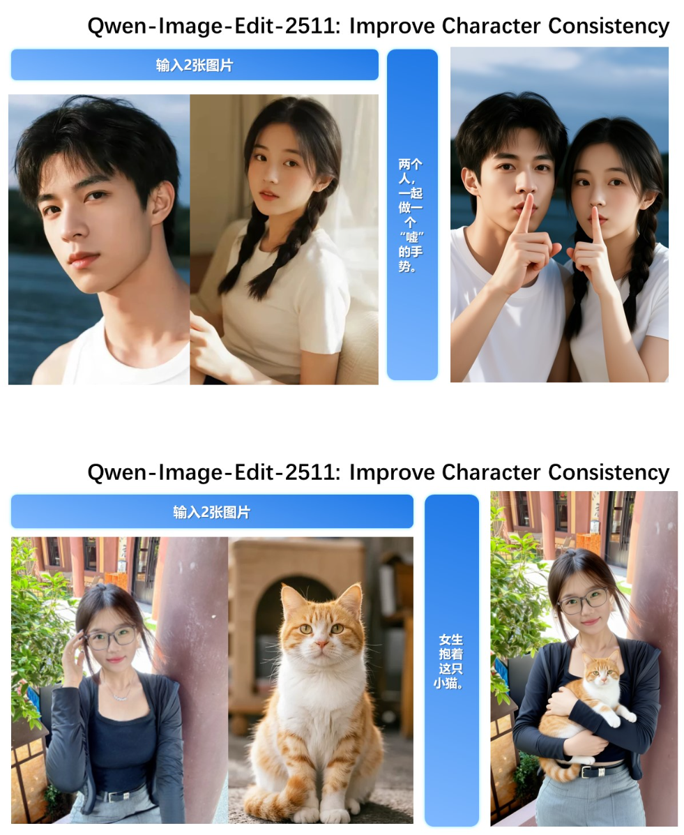 据悉,Qwen-Image-Edit-2511 相较 2509 版本进一步减轻了图像漂移、大幅提升了单/多人角色一致性、内置 LoRA 能力,同时具备精准文字编辑与多图像融合创作能力。