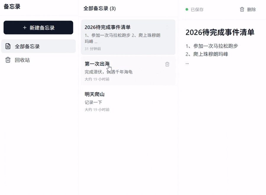 比如,我让 M2.5 写一个备忘录系统,需支持增、删、修改以及回收站管理,整体保持简约风格并支持多端查看。