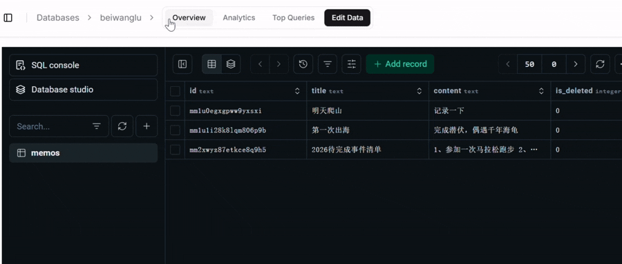 经过一番调试后,备忘录程序跑通了,我试着增加并删除一些数据,看看数据库是否同步: