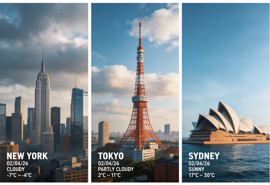 搜索纽约、东京、悉尼今日的天气、温度和时间,高概念合成摄影作品。只需要返回一张图,图像由3个垂直全景条带无缝拼接而成,每个条带分别呈现特定地点的实时天气和光照,统一画面电影质感。